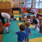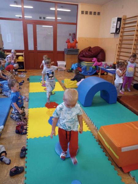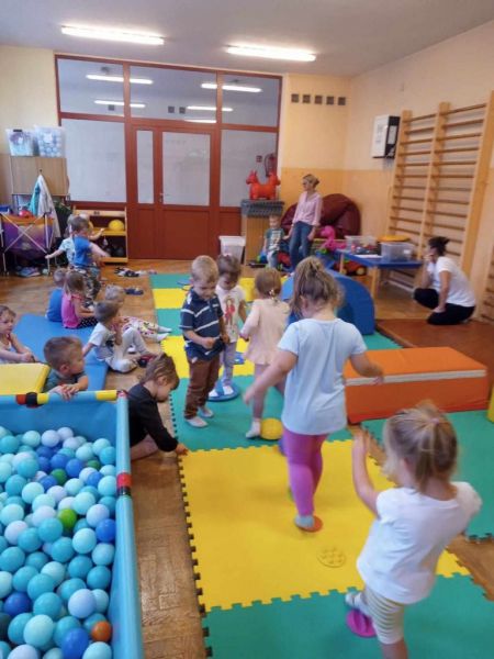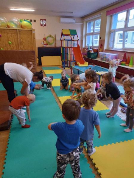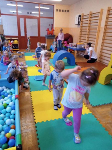 Podczas zwiedzania przedszkola dzieci poznały panią Kasię która prowadzi zajęcia z gimnastyki korekcyjnej.Dzieciom bardzo spodobala się sala oraz sprzęt sportowy.Wszystkie przedszkolaki bardzo chętnie wzięły udział w zabawach ruchowych zaproponowanych przez panią Kasię. W myśl hasła: Gimnastykuj się codziennie, bo to zdrowo i przyjemne.