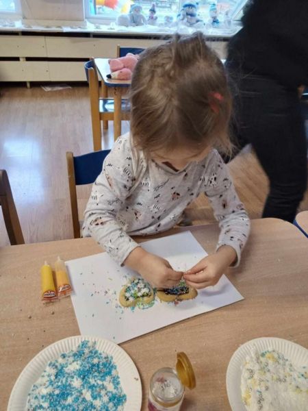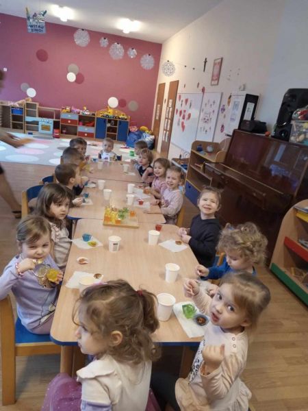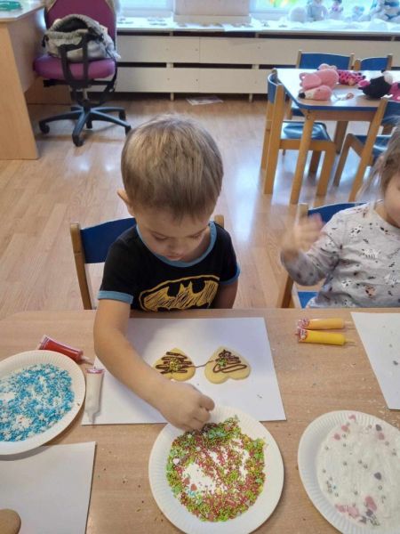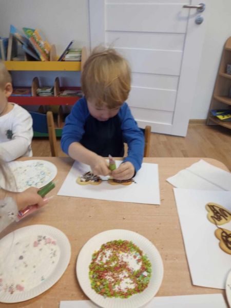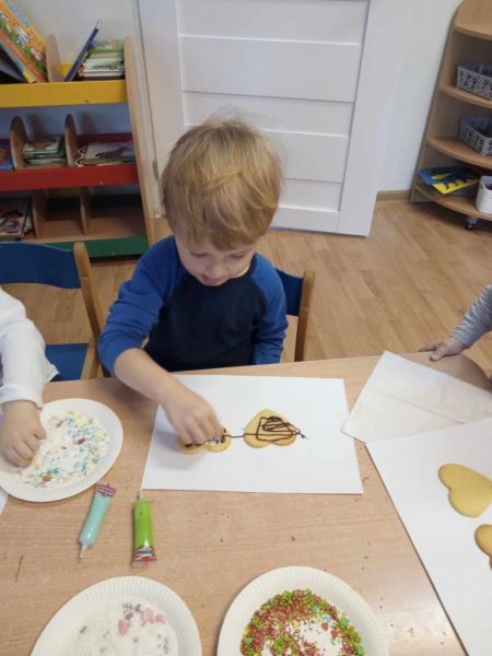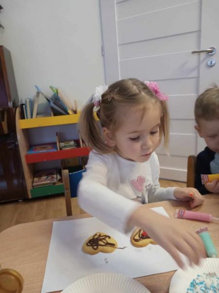 24.01.2024 w środę maluszki zamieniły się w cukierników.Z okazji zbliżającego się: ,, Dnia Babci i dziadka' małe wnuczki i wnukowie zrobili prezent dziadkom w postaci pysznych łakoci- słodkich ciasteczek . Każdy maluszek z wypiekami na twarzy dekorował serduszko dla dziadka i babci. Podczas pracy dziaci w sali grupy pachniało czekoladą, słodkim kolorowym lukrem oraz posypkami w róznych kolorach i kształtach. Cukiernicze dzieło udało się maluszkom wspaniale o czym mogli sie przekonać podczas degustacji wypieków przez dziadków.Zachwytom nad ciasteczkami ze strony gości nie było końca.